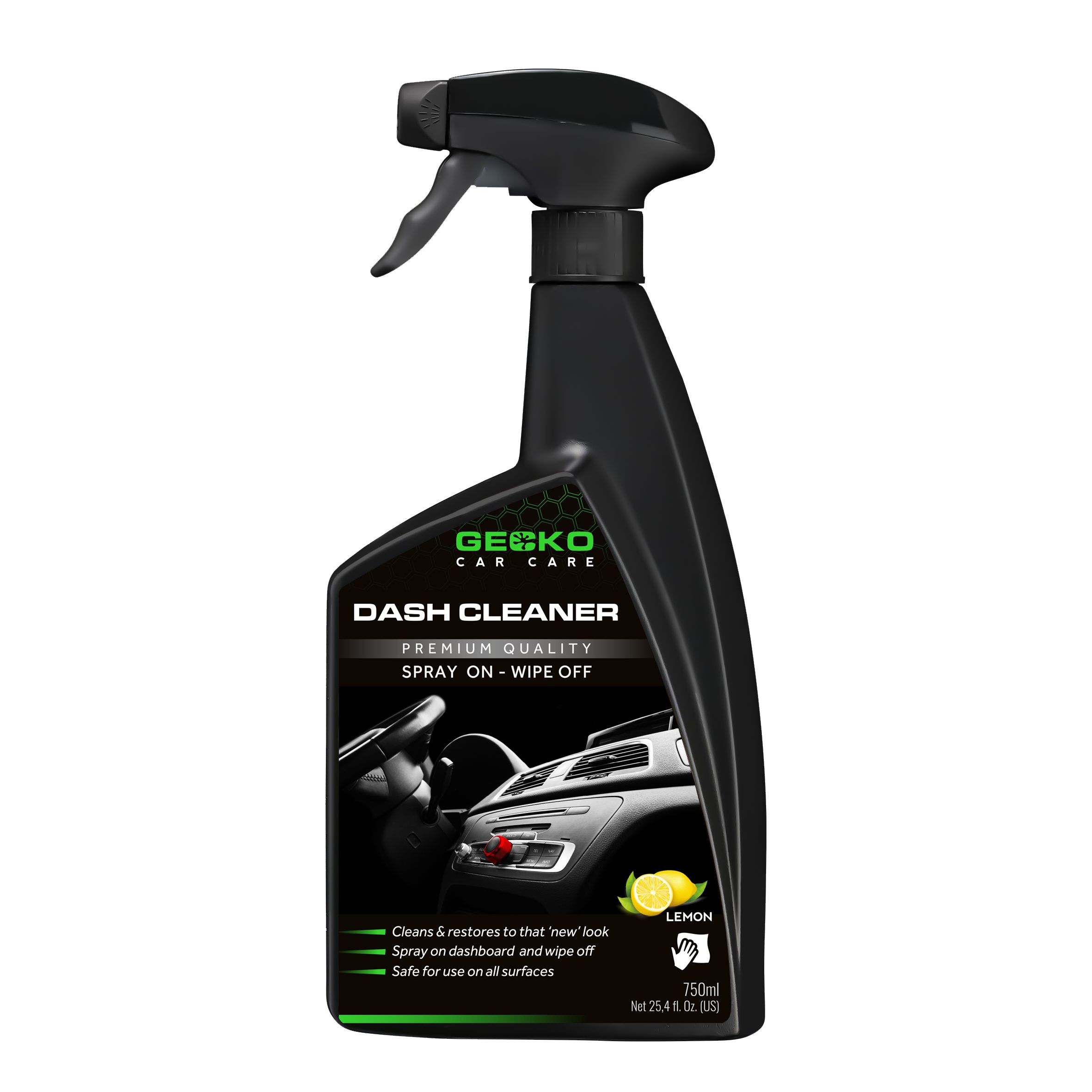 Herstel de natuurlijke kleur van je dashboard met Gecko Dash cleaner, een krachtige dashboardreiniger met citroengeur, waarmee je makkelijk reinigt, een beschermende laag aanbrengt en die een aangename geur achterlaat. Er ontstaat er een natuurlijke frisse glans. De dashboardreiniger is makkelijk in gebruik, laat geen strepen, vet of stof achter. Wij adviseren om een schone droge (en bij voorkeur microvezel-)doek te gebruiken.